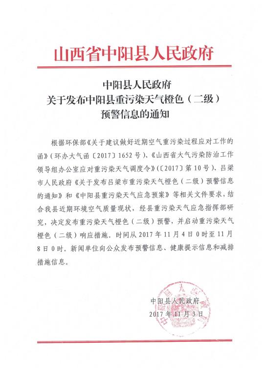 中阳县人民政府关于发布中阳县重污染天气橙色(二级)预警信息的通知