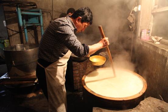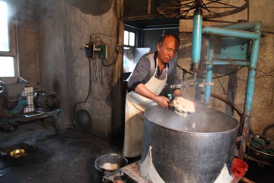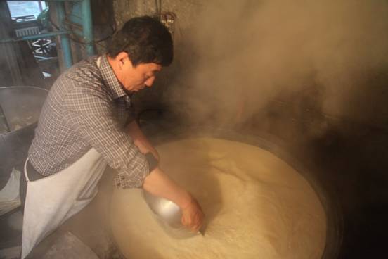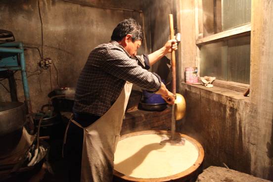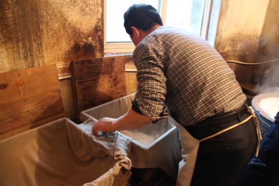 图为在许玉平的豆腐作坊内,许师傅正在用卤水点豆腐,这道工序至关重要。