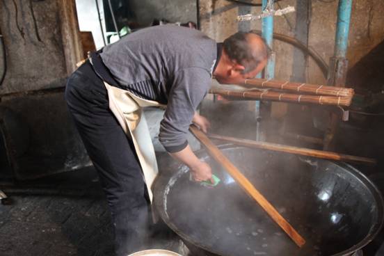 铁锅、火炉,对于传统的豆腐坊,是必不可少的“工具”。56岁的许师傅从29岁开始做豆腐,有着27年制作经验的